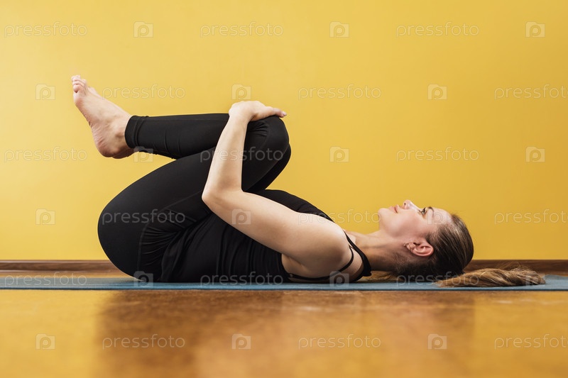 Спортивная привлекательная женщина, практикующая йогу, выполняющая упражнения апанасаны на коврике у стены, в позе высвобождения ветра, в студии йоги