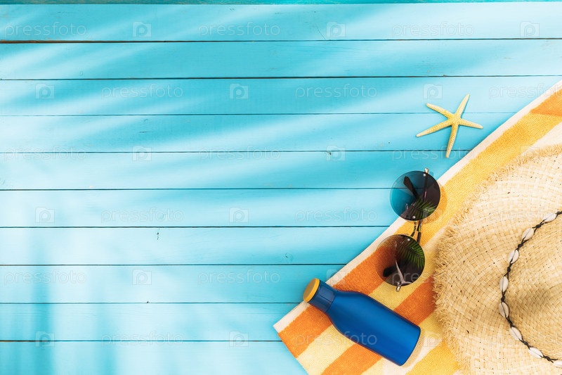 Полотенце, шляпа, солнцезащитные очки, солнцезащитный крем и морская звезда на синем деревянном фоне с копией пространства