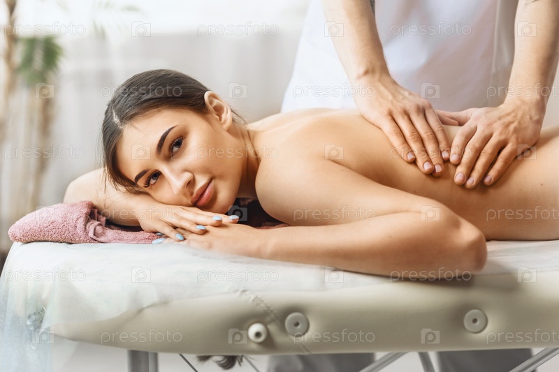 Молодая красивая женщина в салоне на приеме у массажиста, отдыхает во время сеанса терапии