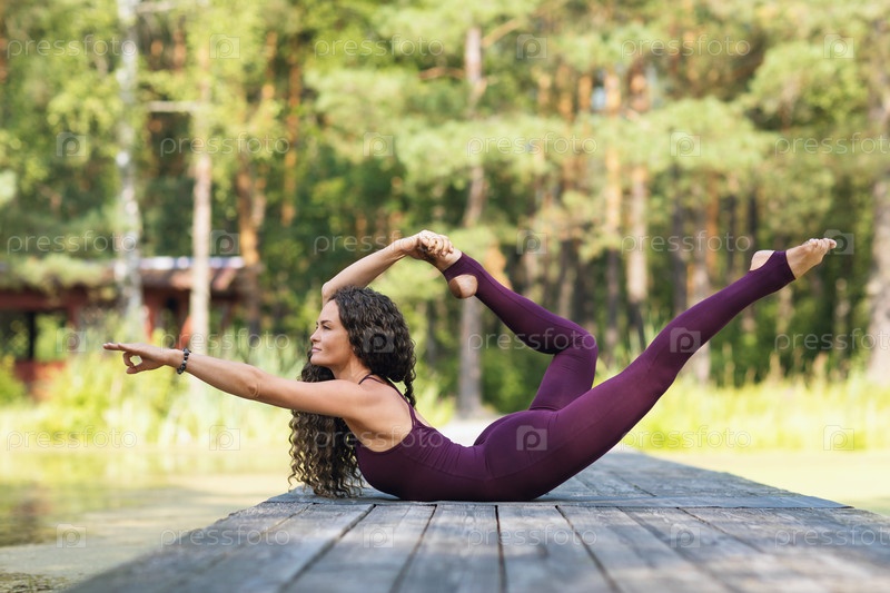 Красивая спортивная женщина, практикующая йогу, на деревянном мосту в парке теплым солнечным утром выполняет упражнения шалабхасана в сочетании с дханурасаной