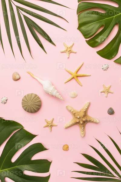 Различные ракушки и листья тропических растений на розовом фоне, вид сверху