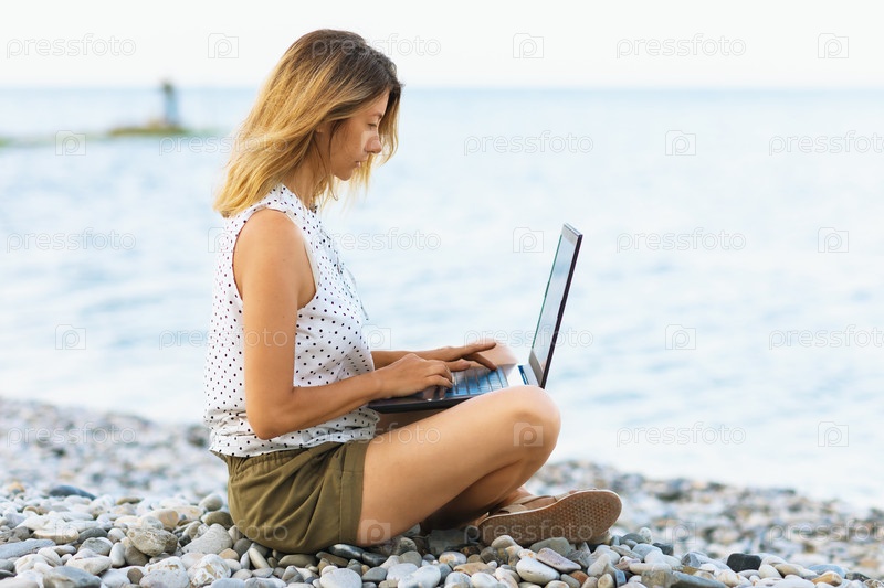 Женщина работает за компьютером на берегу моря, совмещает отдых и работу