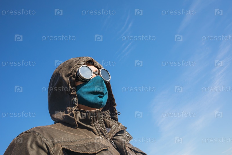 Мужчина в капюшоне, в винтажных очках в стиле стимпанк и защитной маске на фоне голубого неба, концепция жизни в период ограничений на коронавирус, взгляд в будущее