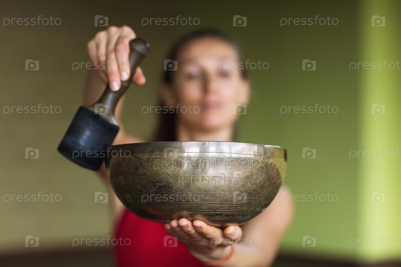 Женщина, практикующая йогу, выполняет звуковую медитацию в студии с помощью металлической чаши