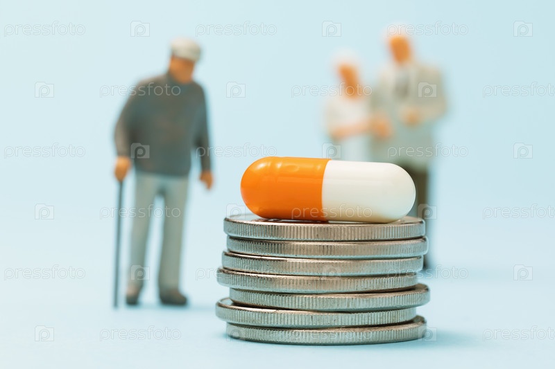 Планшет на стопке монет и игрушечных человечков на синем фоне, концепция дорогих лекарств для пенсионеров