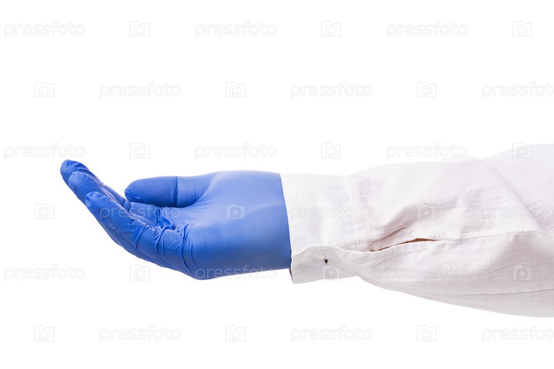 Протянутая рука врача в перчатках на белом фоне, шаблон для дизайнеров