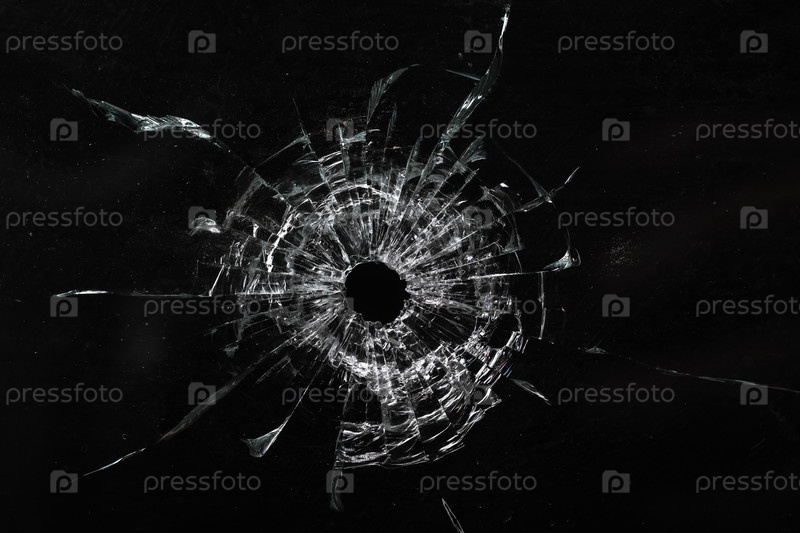 Грязное стекло с пулевым отверстием в центре на черном фоне, крупный план