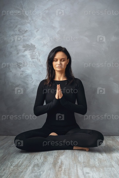 Женщина в черной спортивной одежде, практикующая йогу, практикует медитацию, сидя в позе лотоса с намасте, у стены в комнате