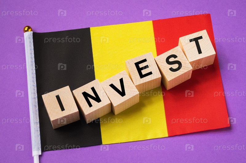 Деревянные кубики с текстом и флагом на цветном фоне, концепция инвестиций из Бельгии