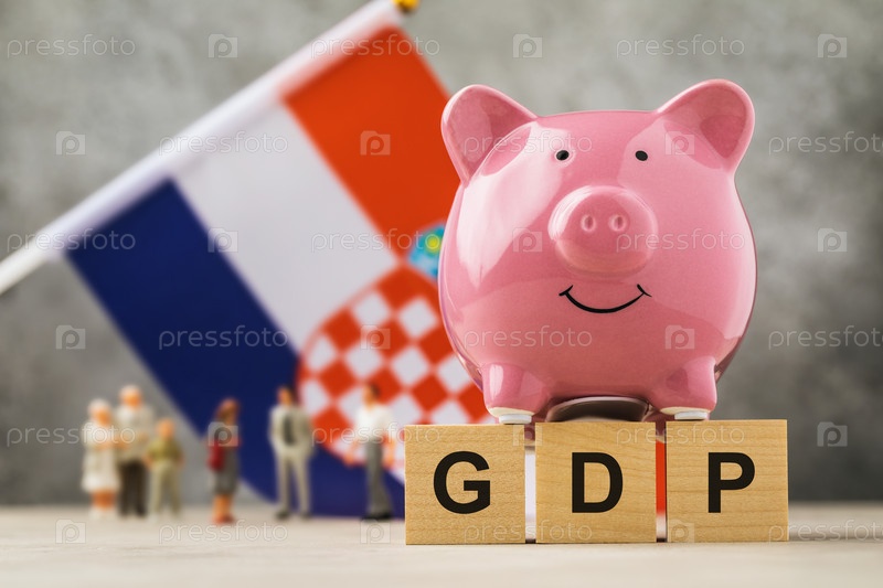 Копилка, деревянные кубики с текстом, игрушечные человечки из пластика и флаг на абстрактном фоне, концепция на тему ВВП Хорватии