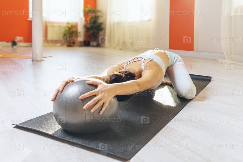 Женщина в спортивной одежде занимается йогой, делает упражнения баласана с мячом, поза ребенка, сидит на коврике в студии