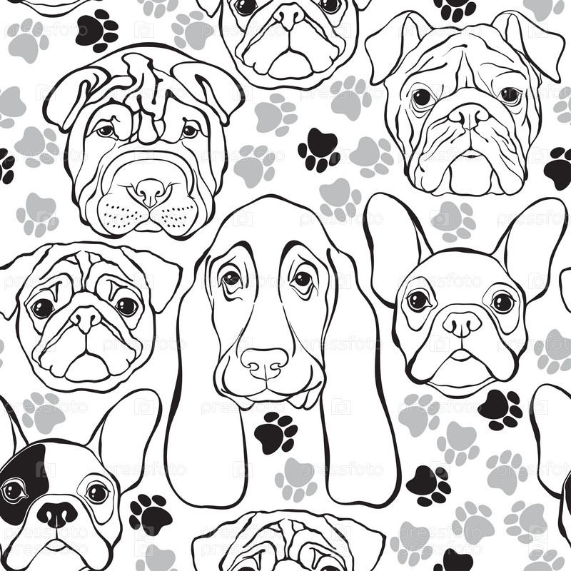 Бесшовный рисунок с лицами собак и следами. Монохромный фон