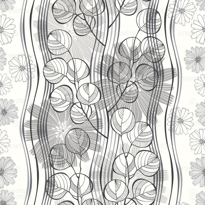Бесшовный узор с абстрактными ветвями и цветами. Черно-белый рисованный цветочный фон