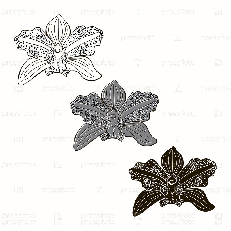 Векторный набор орхидей, изолированные на белом фоне. Монохромная иллюстрация, элементы дизайна