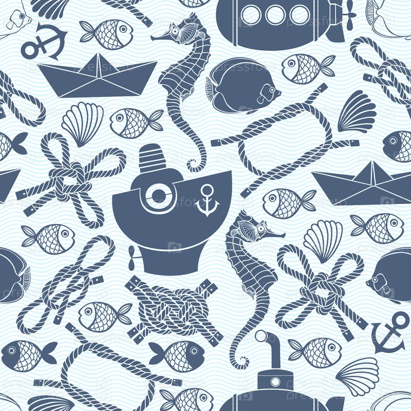 Бесшовный рисунок с мультяшными морскими элементами. Морской фон, милый детский фон