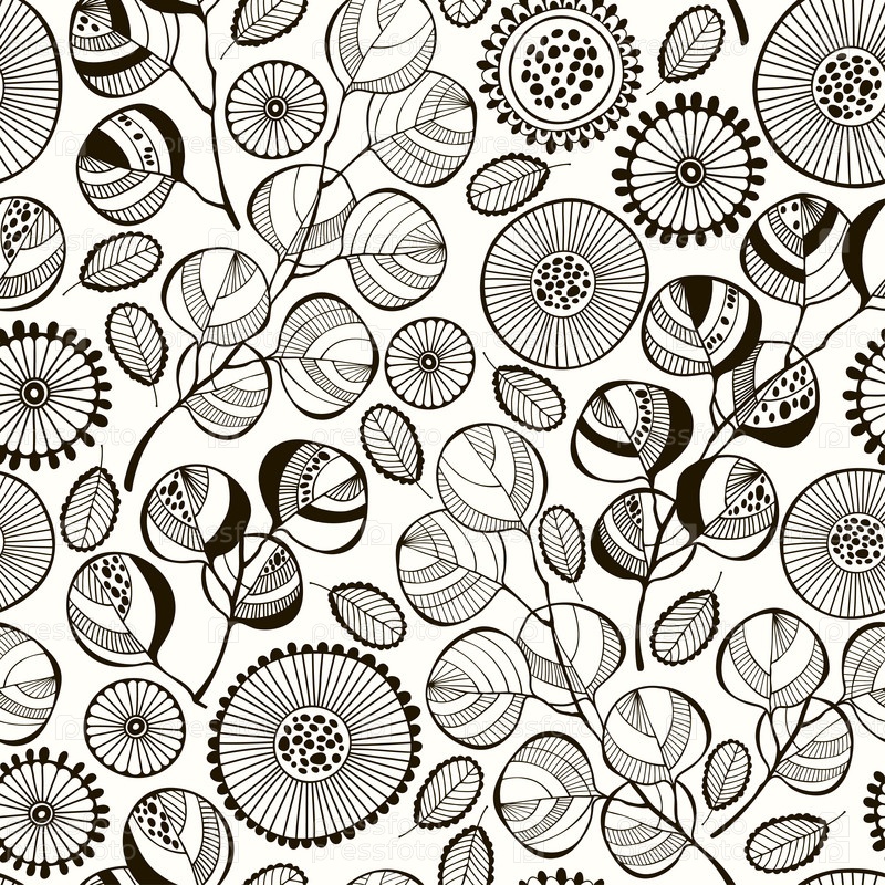 Бесшовный узор с абстрактными ветвями и цветами. Черно-белый рисованный цветочный фон