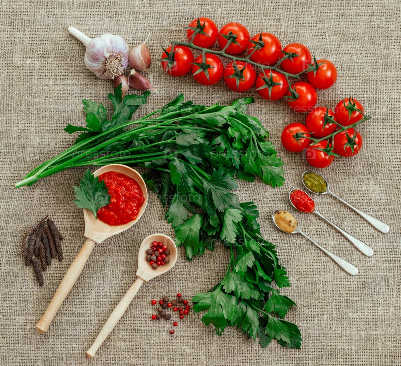 Продовольственный фон. Плоская укладка. Помидоры черри, пучок петрушки, перец черный и красный, чеснок и соусы аджика, песто, горчица на мешковине. Ингредиенты для маринования, соусов или салатов