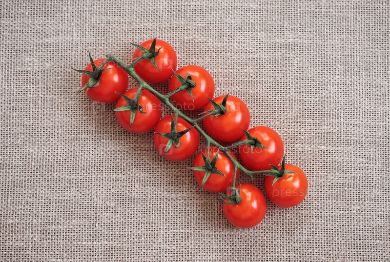 Красный помидор на бежевом фоне. Помидор черри на зеленой ветке на мешковине. Вид сверху