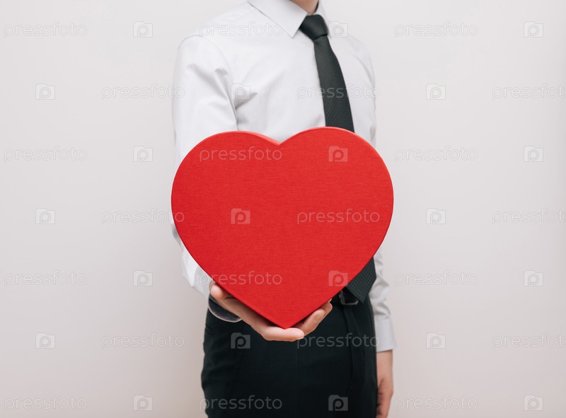 Человек с большим подарком красного сердца в руке на белом фоне. Концепция любви и Дня святого Валентина. Копировать пространство