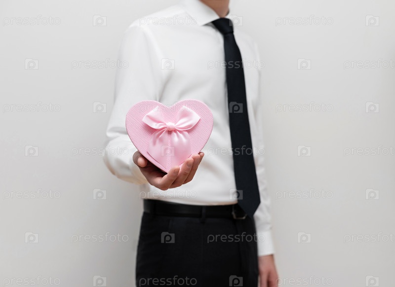 Мужчина с подарком в виде розового сердца в руке на белом фоне. День святого валентина и концепция любви