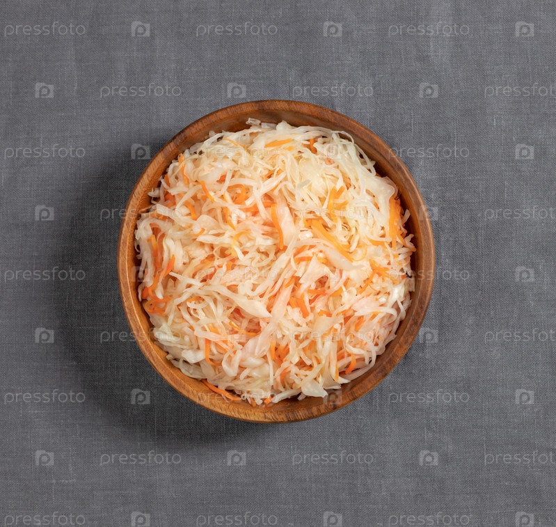Квашеная капуста в деревянной миске на сером фоне крупным планом. Ферментированная пища. Капустный салат с морковью. Вид сверху, плоская планировка