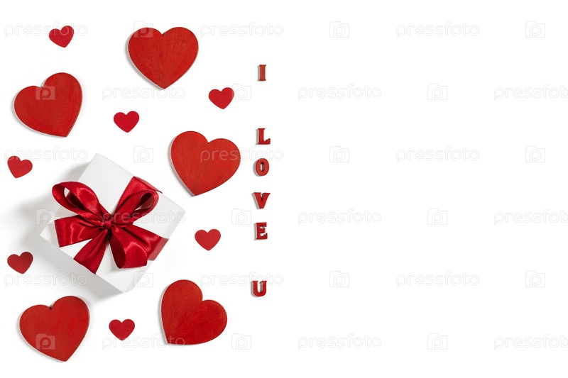 Романтическая рамка с подарками, красными сердцами и текстом, который я тебя люблю, изолирован на белом фоне. Концепция Дня Святого Валентина. Копирование пространства, вид сверху, плоская планировка