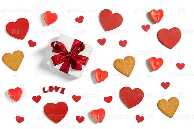 День святого Валентина с сердечками, подарком и имбирным печеньем на белом фоне. Открытка на день Святого Валентина. Вид сверху, плоская планировка