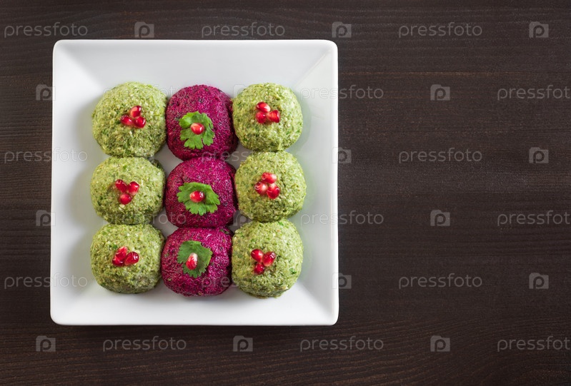 Пхали со свеклой и фасолью на темном деревянном фоне. Традиционное грузинское блюдо из овощей, грецких орехов и специй. Скопируйте пространство. Плоская планировка, вид сверху