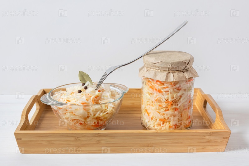 Домашняя квашеная капуста. Ферментированная пища. Квашеная капуста с морковью в стеклянной банке и миске в деревянном подносе на белом фоне