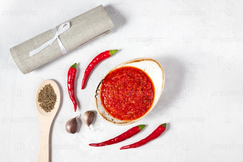 Паста из острого перца чили харисса. Аджика на белом фоне. Традиционная тунисская, грузинская и арабская кухня. Домашняя розовая харисса в миске