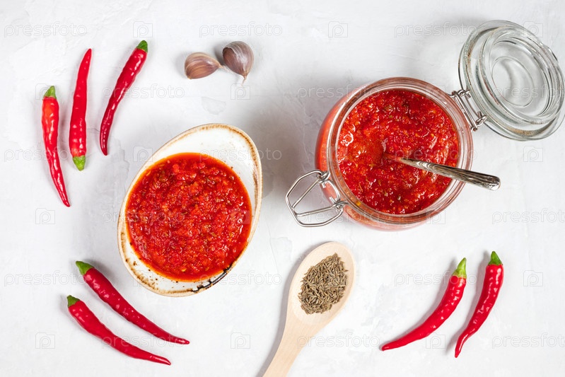 Паста из острого перца чили харисса. Аджика на белом фоне. Традиционная тунисская, грузинская и арабская кухня