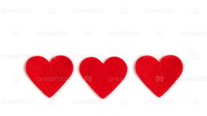 Красные текстильные сердца на белом фоне. День святого Валентина или день матери фон. Скопируйте пространство, вид сверху