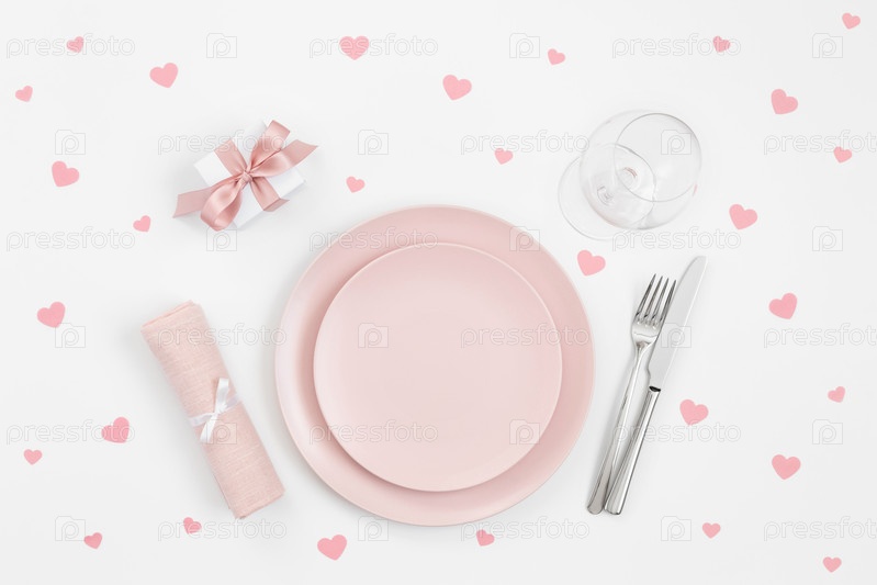 Розовая сервировка стола с сердечками конфетти, подарок, салфетка на белом фоне. Романтический или свадебный ужин. День святого валентина или день матери фон