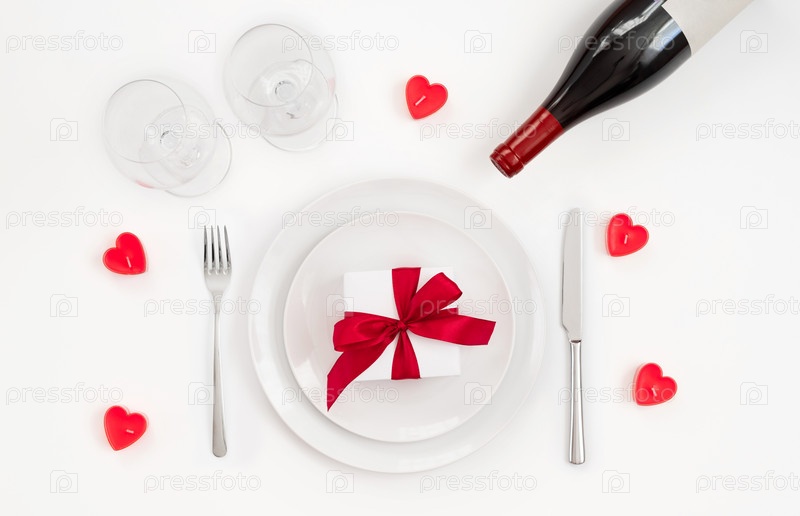 День святого Валентина или романтический ужин фон. Праздничная романтическая сервировка стола на белом фоне. Валентинка