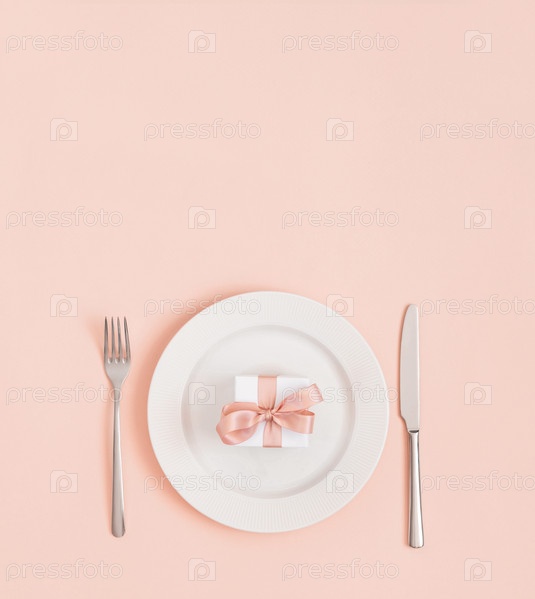 Праздничная сервировка стола на День святого Валентина, День матери, День рождения или Рождество. Подарок в тарелке на пастельно-розовом фоне. Минимальная концепция. Место для текста. Вид сверху, плоская планировка