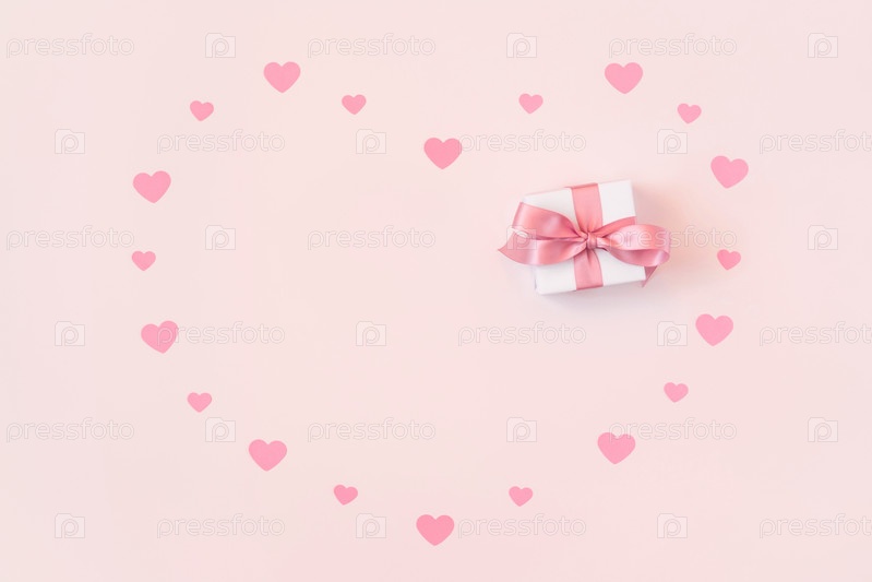 Открытка на День святого Валентина. Маленькие сердечки конфетти и подарок на розовом фоне. Концепция дня святого валентина. Место для текста