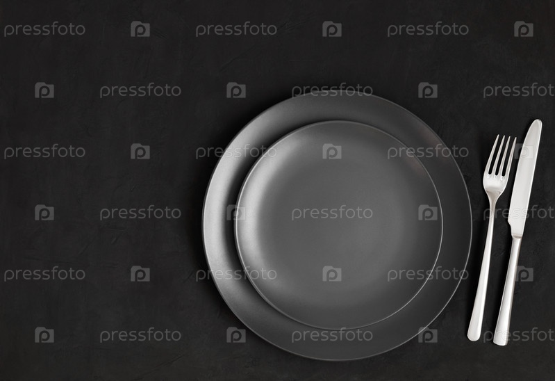 Черная сервировка стола. Пустая черная тарелка и серебряные столовые приборы на темном бетонном фоне. Вид сверху. Копировать пространство