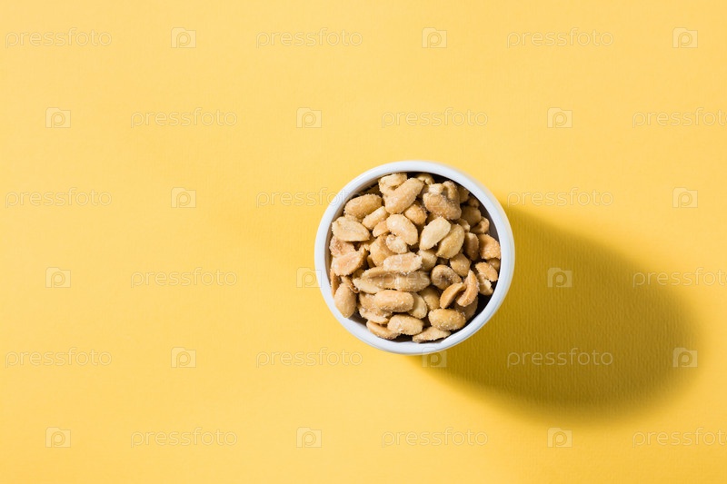 Соленый арахис в белой миске на дельтовидном фоне в жестком свете. Здоровая современная вегетарианская еда. Вид сверху