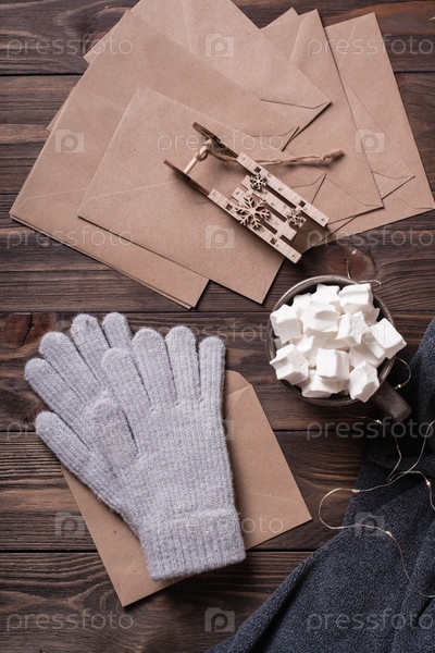 Зимний натюрморт. Пейте с зефиром, шерстяными перчатками и ремесленными конвертами на деревянном фоне