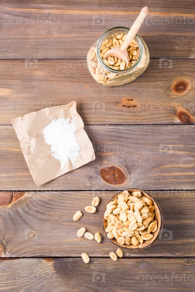 Соленый арахис в миске и в банке с ложкой и солью на бумаге на деревянном столе. Здоровая вегетарианская еда. Деревенский стиль. Вертикальный и вид сверху