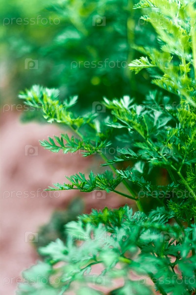 На фоне пышной зеленой моркови на грядке. Выборочный фокус