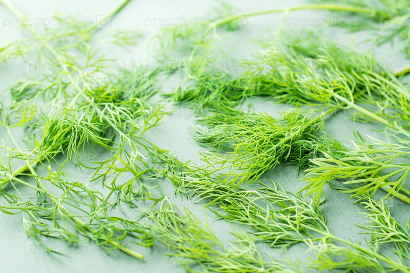 Ветви свежего укропа хаотично на зеленом фоне. Витаминные травы в здоровом питании