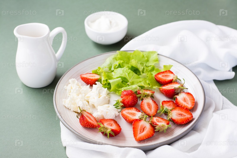 Свежая целая и нарезанная клубника, творог и салат на тарелке и сметана в миске на зеленом фоне. Летний витаминный перекус