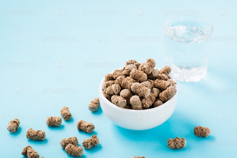 Ржаные отруби в миске и на столе и стакан воды на синем фоне. Диета и очищение организма клетчаткой