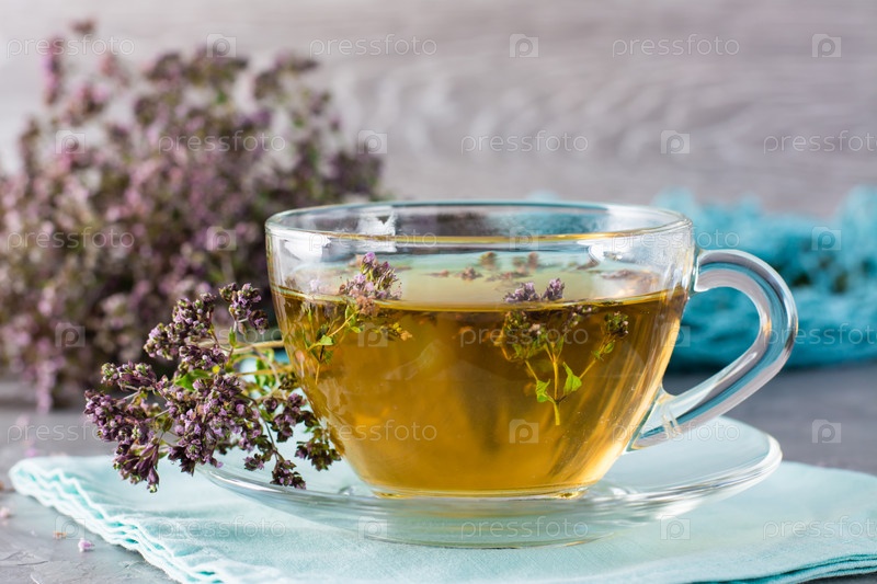 Лечение травами. Чай с орегано в стеклянной чашке на столе. Расслабляющий напиток