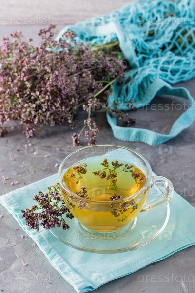Альтернативная медицина. Чашка чая с орегано на столе и сухой пучок трав рядом