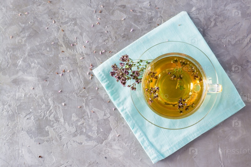 Лечение травами. Чай с орегано в стеклянной чашке на столе. Расслабляющий напиток. Вид сверху. Копировать пространство