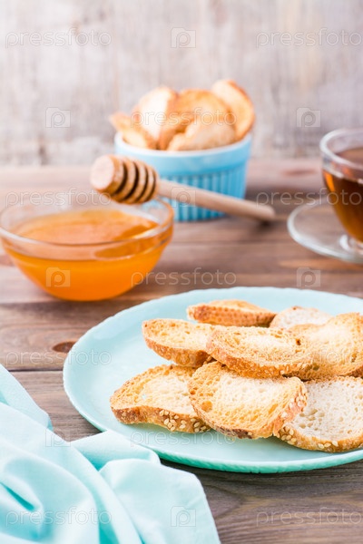 Небольшой тост из багета на тарелке на деревянном столе. Вертикальный вид