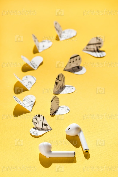 Беспроводные наушники и сердца, вырезанные из музыкального текста на желтом фоне. Люблю слушать музыку с помощью гаджетов. Вертикальный вид