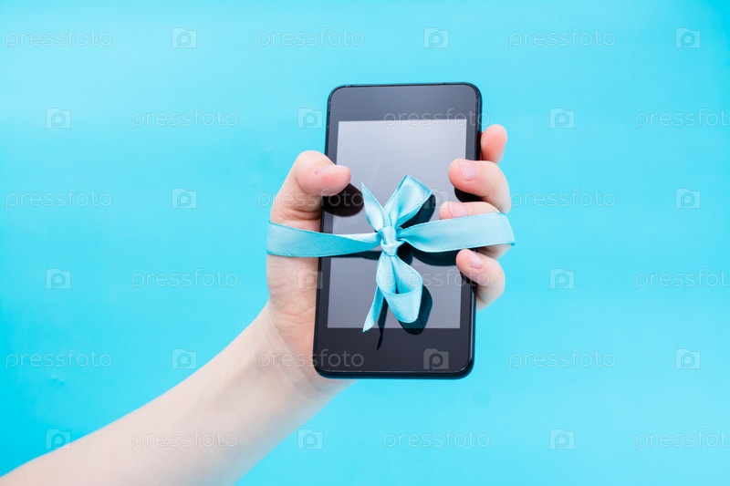 Концепция цифровой детоксикации. Детская рука со смартфоном, перевязанная голубой лентой. Зависимость от гаджетов
